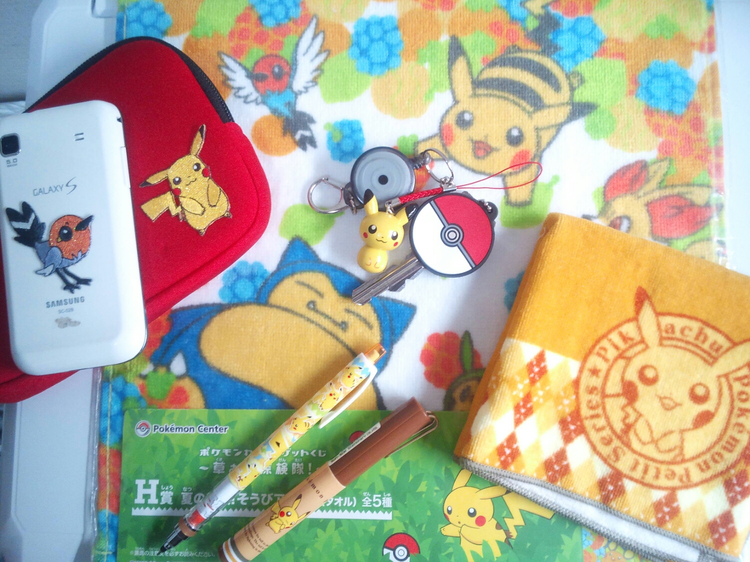 内訳としては、携帯ハサミ(ピカチュウ)、クルトガシャーペン(ピカチュウ)、タオルハンカチ(ピカチュウ)、キーカバー(モンスターボール)、こけしすとらっぷ(ピカチュウ)、刺繍デコシール(ピカチュウ、ヤヤコマ)、わくわくゲットくじH賞タオル・・このラインナップ見てると、私はどれだけピカチュウが好きなんだって感じですよねwwまあ実際ピカチュウ大好きですけどvvwww